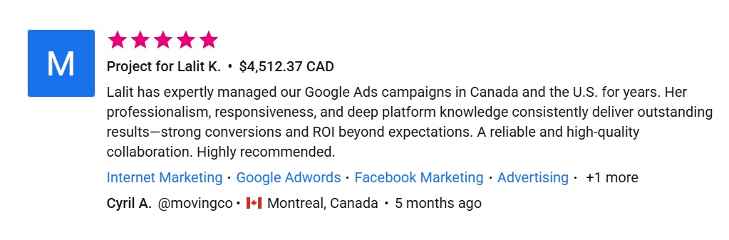 “Lalit has expertly managed our Google Ads campaigns in Canada and the U.S. for years. Her professionalism, responsiveness, and deep platform knowledge consistently deliver outstanding results—strong conversions and ROI beyond expectations. A reliable and high-quality collaboration. Highly recommended.”